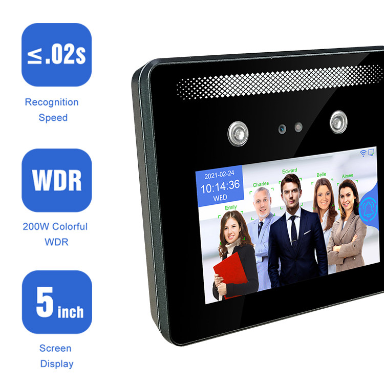 Quando funziona una macchina di partecipazione di tempo, può sostenere il fronte, carta del rfid e la parola d'ordine, metodo dell'identificazione di codice di QR, anche la sua progettazione a 5 pollici orizzontale della visualizzazione può permettere 5 persone affronta la verifica nella manifestazione e nella rilevazione dello schermo. Il dispositivo AI05 adotta la tecnologia di WDR, può lavorare bene nella riflessione luminosa di luce solare. Quando il dispositivo AI05 funziona una macchina del controllo di accesso, può sostenere la rilevazione della maschera e la restrizione dell'accesso della fascia oraria per la persona sicura o determinato periodo di tempo. quale può controllare l'accesso con la gestione dell'autorità.
