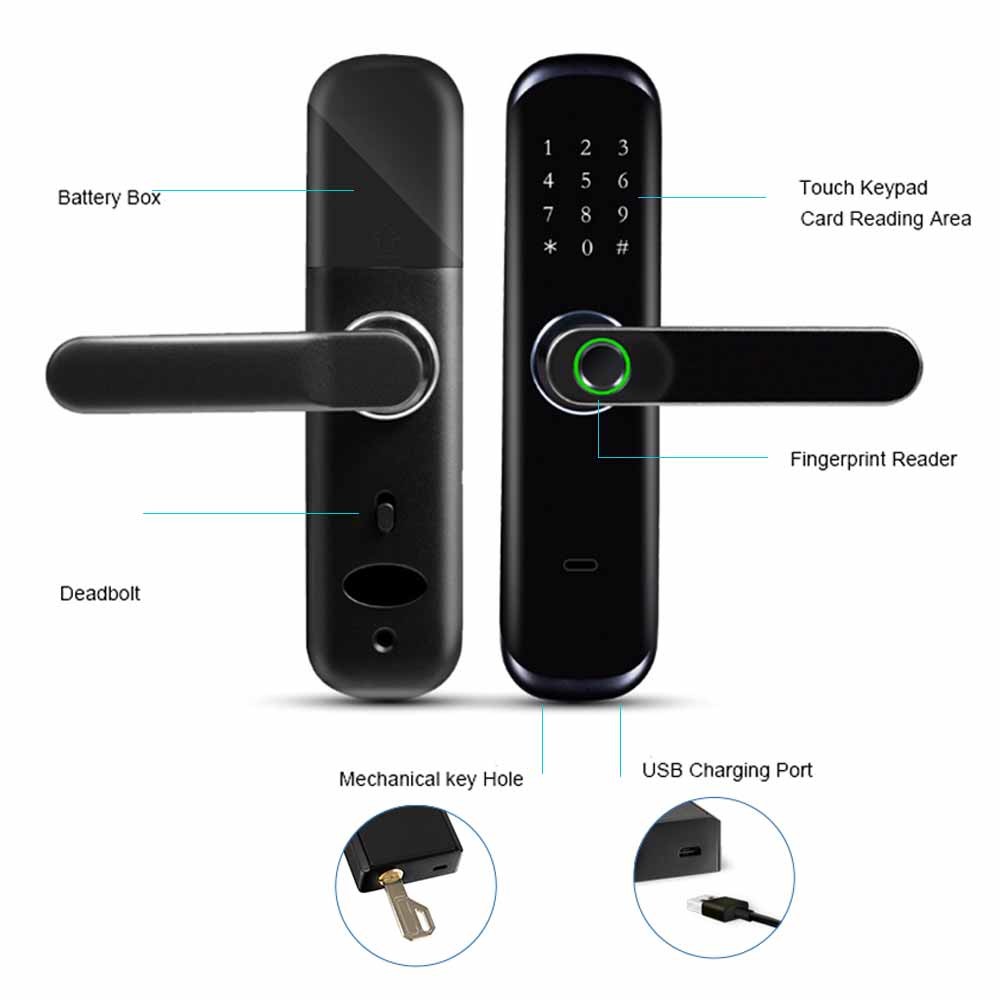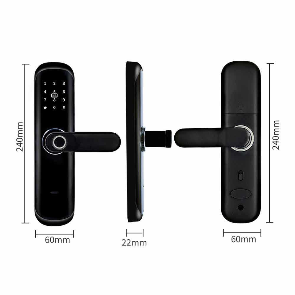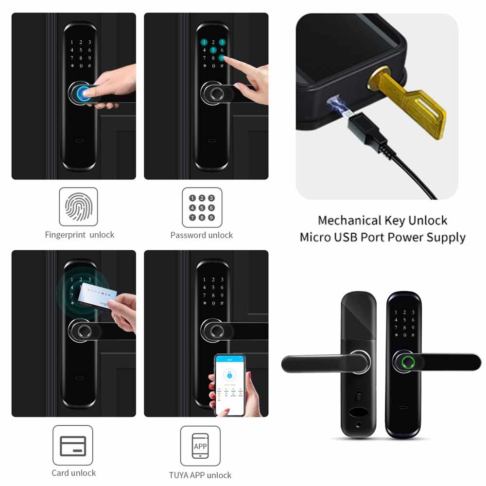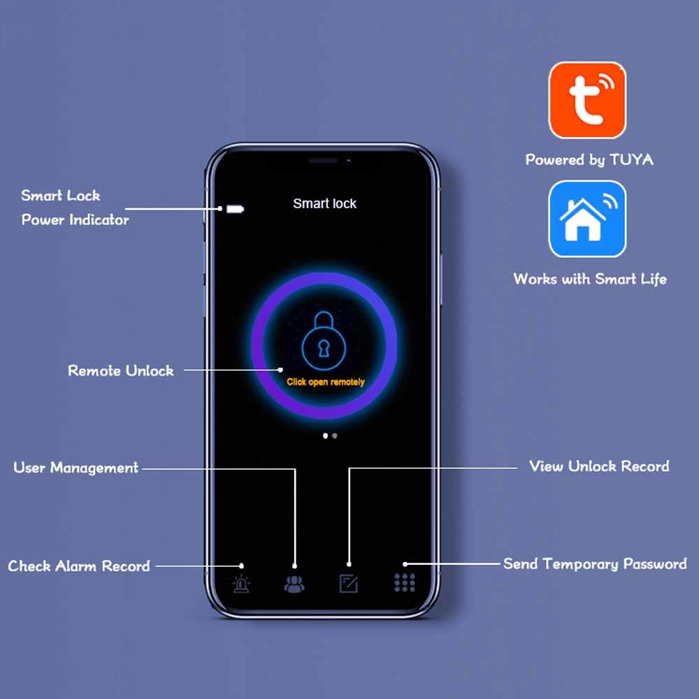 Ha un conveniente dirige il sistema e 6 modi sbloccare: L'impronta digitale sblocca, BLE APP sbloccano, WiFi a distanza sblocca, parola d'ordine PIN Unlock, la carta sblocca e le chiavi meccaniche Unock.It soddisfaranno tutta l'vostra esigenza circa la serratura astuta. Con la gestione avanzata di APP, via WiFi o BLE collegare la serratura astuta al vostro smartphone ed a voi può dirigere la vostra serratura di porta astuta dovunque ed in qualunque momento.